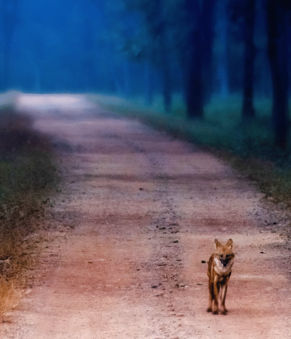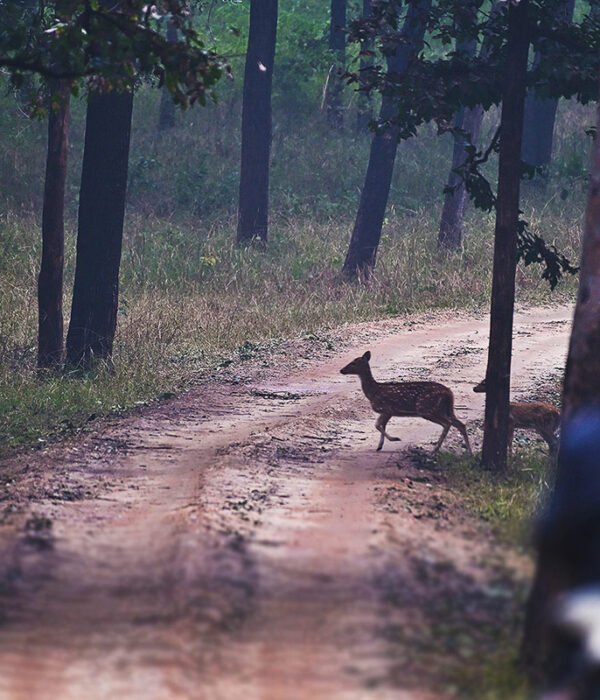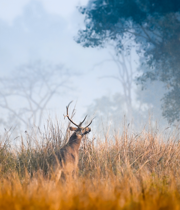In the calm of Kanha’s Mukki Zone, a chital deer grazes peacefully in the soft morning sun. The shade of a tall tree gives the deer a quiet place to rest, while golden sunrays gently stream through the branches, making everything look magical and serene. It's a perfect moment where nature’s beauty comes alive, peaceful and untouched.